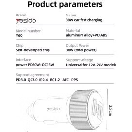 شارژر فندکی دارای کابل ۳۸ وات برند Yesido برند Y60