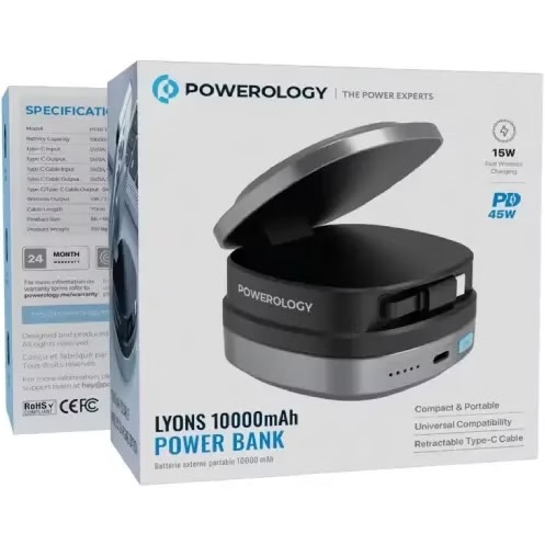 پاوربانک برند Powerologyمدل Lyons_PPBFT04BK ظرفیت 10000 میلی آمپر ساعت